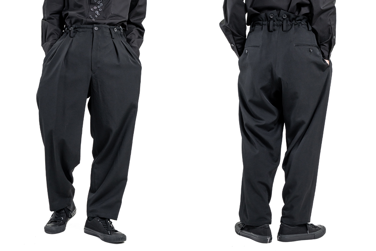 テーパードの効いたヨウジらしい綺麗なシルエットで、タックイン時にサスペンダーディテールが映えます。