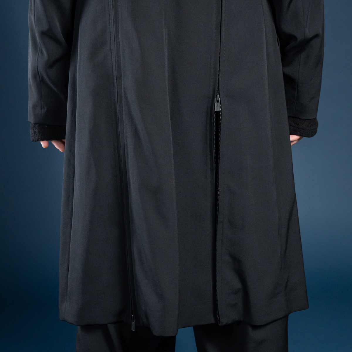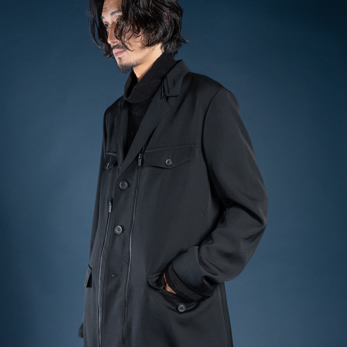 ウールギャバジン100%による重厚感と、ファスナーの開閉でレイヤードの見せ方を変えられる遊び心が魅力です。