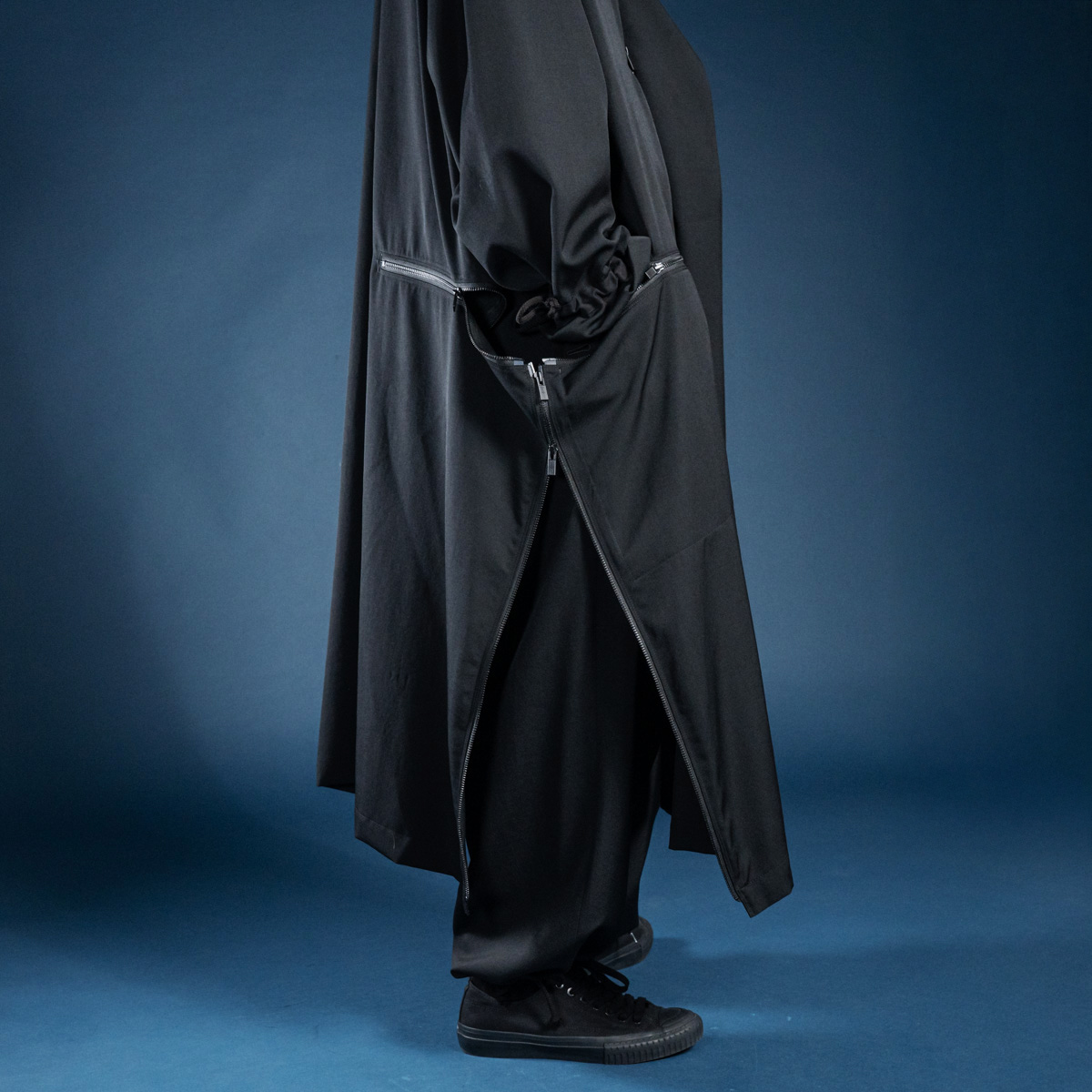 コートの脇にクロス状のファスナーを備え、開閉の仕方で表情が変わるギミックを搭載。