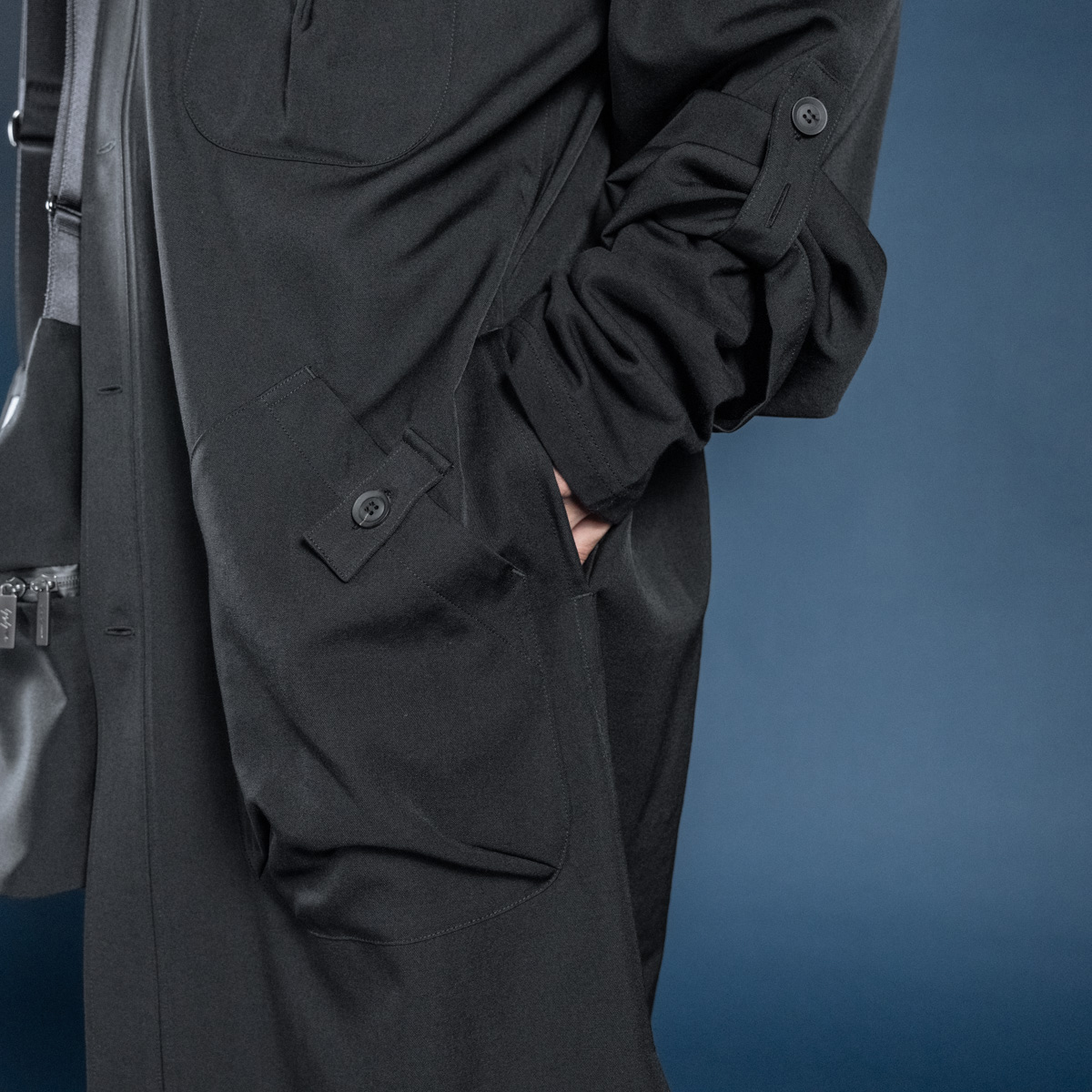 ヨウジヤマモトらしいギャバジン素材と黒のロングシルエットを、これでもかと楽しめる仕上がりになっています。
