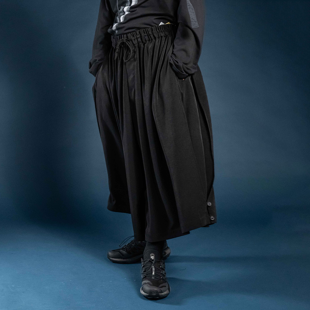 このパンツの最大の特徴は、ボックスプリーツによって構成されたシルエット。